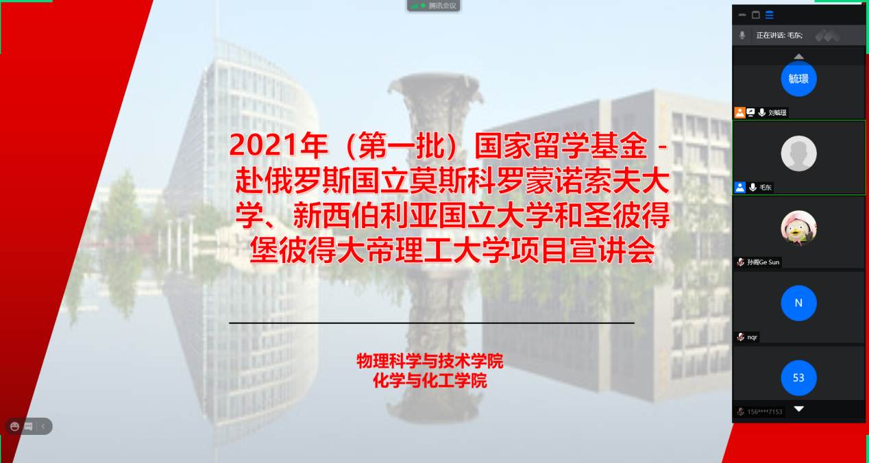首先,毛东副院长对各位老师、同学在假期期间能够积极参与本次线上宣讲会表示感谢,并重点介绍了数理化基础前沿与交叉学科人才培养项目的基本情况。在国家留学基金委资助下,与俄罗斯3所顶尖高校开展深度合作,选派相关学科方向本、硕、博学生深造和联合培养。该项目覆盖面广、合作高校水平高,对提升人才培养的国际化水平具有重要意义。