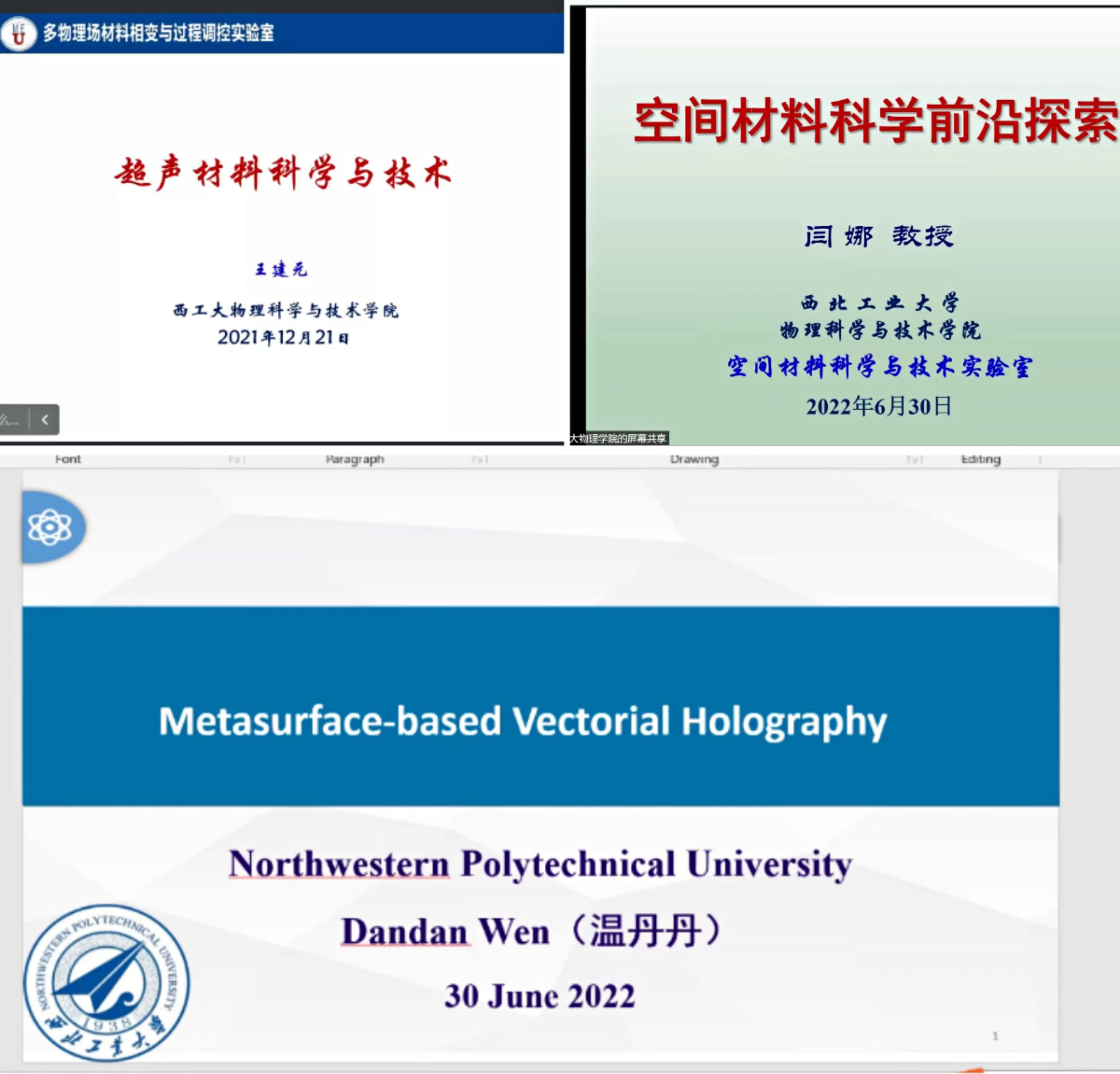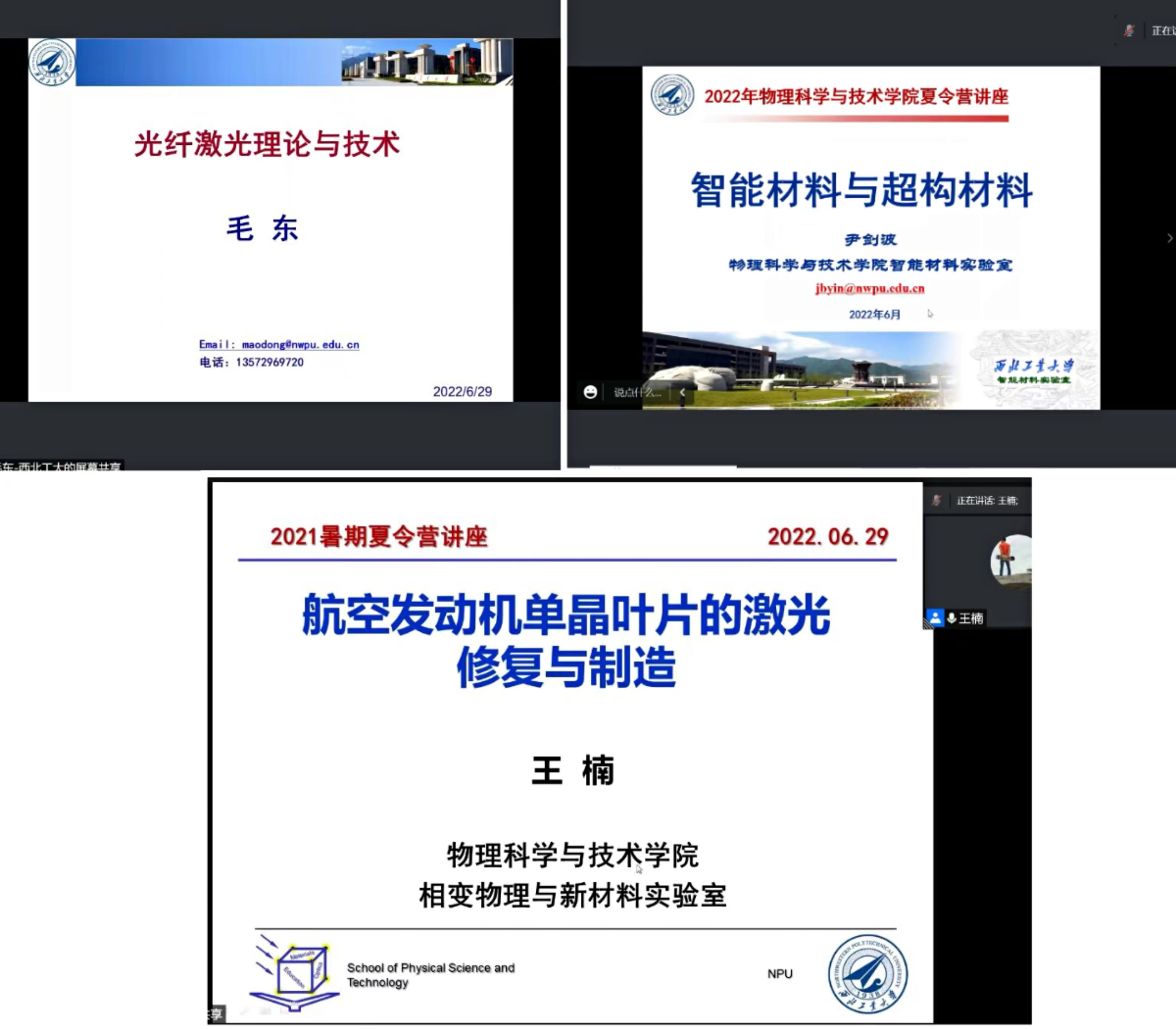 本次暑期学校共安排十场学术讲座,尹剑波教授、王楠教授、毛东教授、张富利教授、臧渡洋教授、金克新教授、谢彦博教授、王建元教授、闫娜教授和温丹丹教授分别围绕“智能材料与超构材料”“航空发动机单晶叶片的激光修复与制造”“锁模光纤激光理论与技术”“复合人工微结构光波调控研究”“液滴蒸发:科学与应用”“氧化物表界面的新奇物性探索”“Small is different”“超声材料科学与技术”“空间材料科学的前沿探索”“超表面光电器件原理及应用”等主题进行了深入浅出的讲解,师生双方通过屏幕展开了精彩热烈的讨论,学生们收获颇丰。