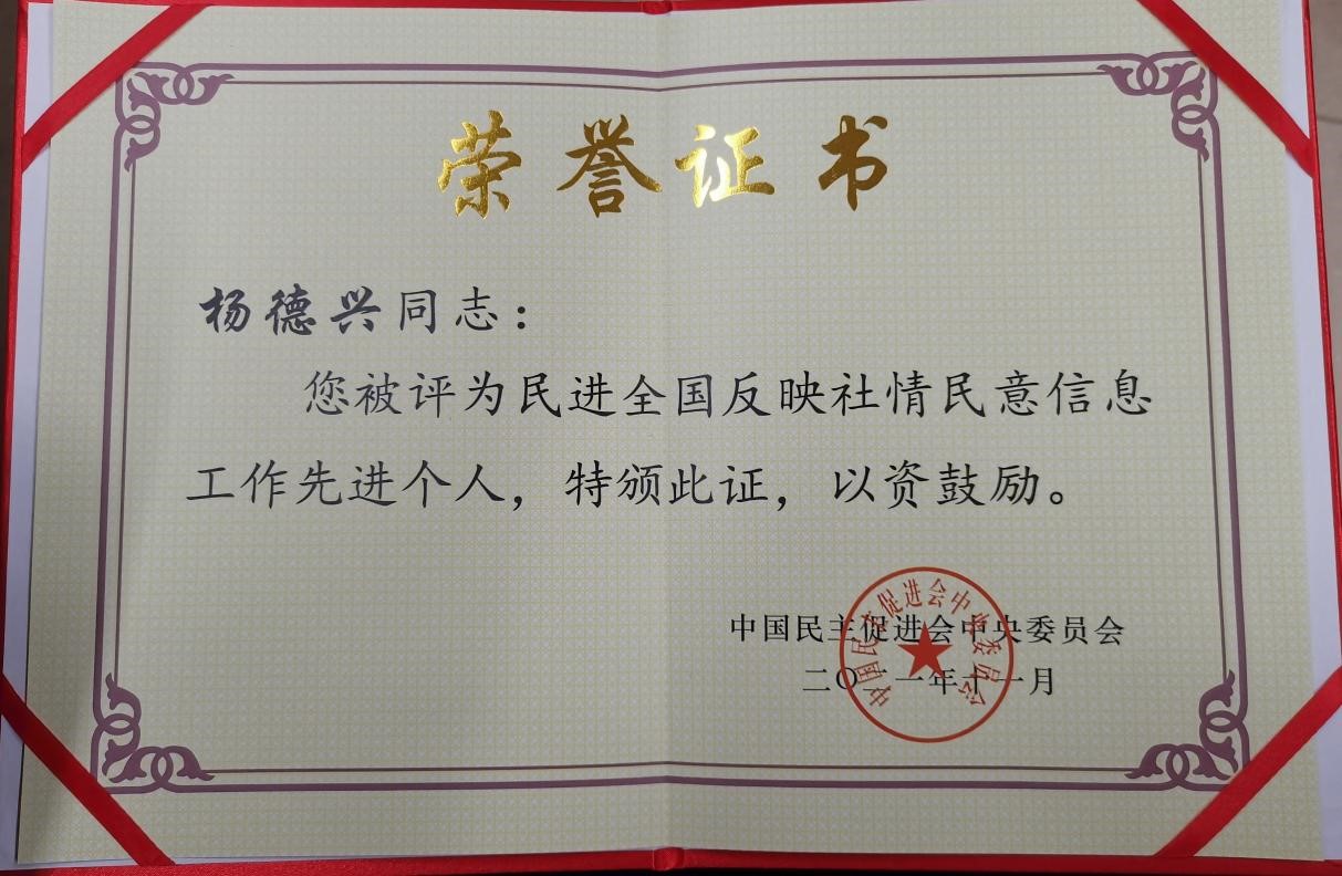 2021年是民进中央反映社情民意信息主题年。为树立典型、表彰先进,激励全会各级组织和广大会员进一步做好反映社情民意信息工作,民进中央于12月1日在北京召开反映社情民意信息主题年工作会暨2021年参政议政年会,对今年以来在反映社情民意信息工作中做出突出成绩的先进集体和个人进行了表彰。民进西工大总支主委、yl9193永利集团教授杨德兴荣获2021年“民进全国反映社情民意信息工作先进个人”。