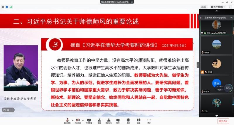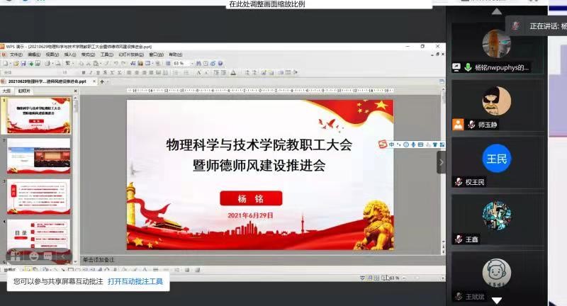 为贯彻落实《教育部关于在教育系统开展师德专题教育的通知》、《永利集团开展师德专题教育实施方案》等,进一步加强物理学院教职工师德师风建设,营造良好师德师风氛围,提升教师队伍整体素质。6月29日晚上,物理学院召开全体教职工大会暨师德师风建设推进会。学院全体教职工90余人参加会议,会议采用线上会议的方式召开,由学院党委书记杨铭主持。