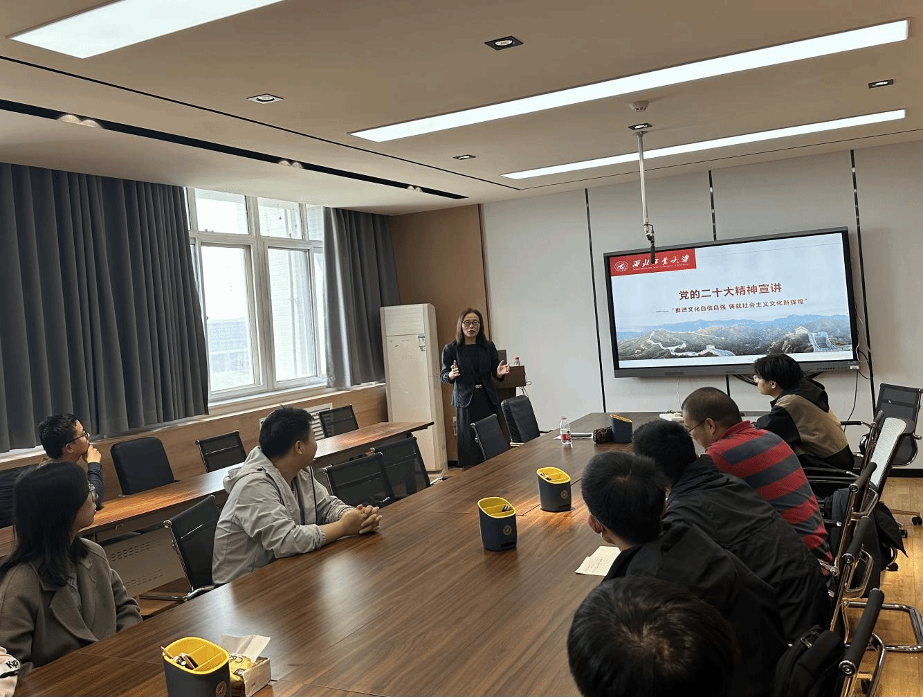 蒲瑶教授以《推进文化自信自强、铸就社会主义文化新辉煌》为题,从分析文化脉络、讲文化应用、做文化传承、重文化创新共四个方面,讲述中华文化发展历程,培养师生家国情怀。结合工作实际和生活实践,她从全球化与世界历史的视角,用丰富多彩、生动有趣的方式及案例阐述了文化自信自强对于实现中华民族伟大复兴的重要性,并就如何推进文化自信自强进行了分享。同时,围绕做好高校思想政治工作的新要求、思想政治工作的新形势、加强和改进新时代新征程思想政治工作等方面做了系统阐述。
