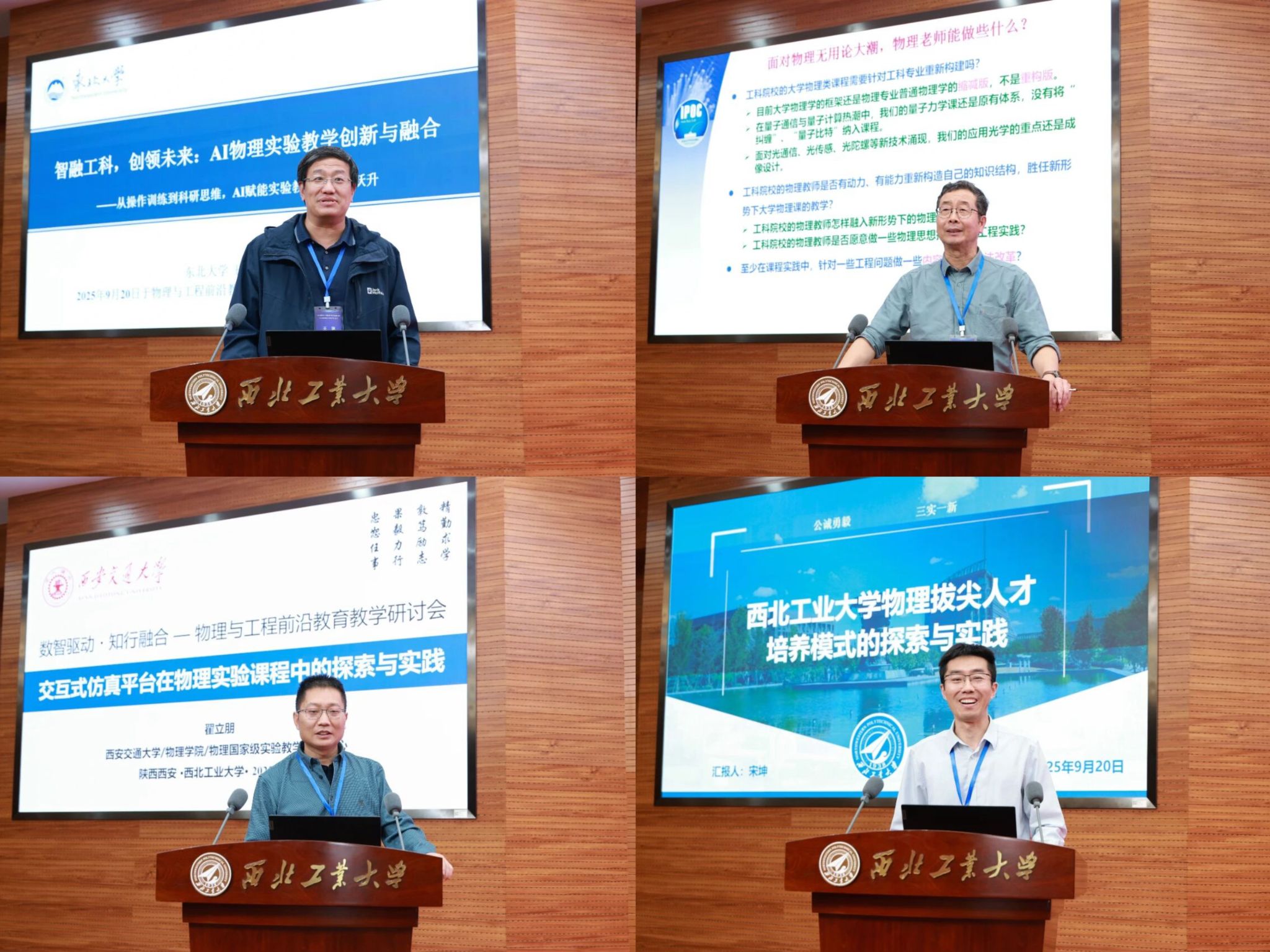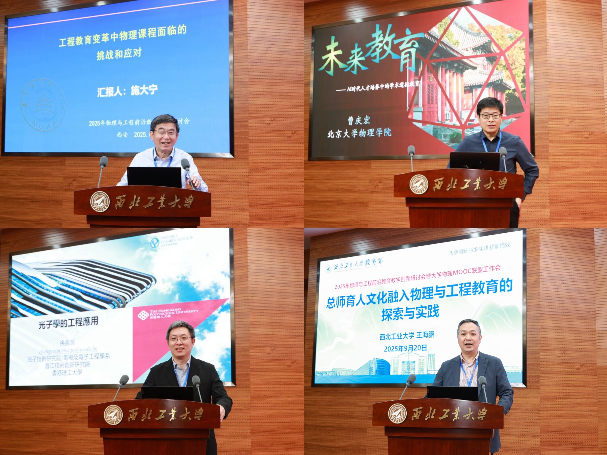 在上午的大会主旨报告环节,南京航空航天大学副校长施大宁教授、北京大学物理学院副院长曹庆宏教授、香港理工大学(晋江)技术创新研究院院长余长源教授、我校教务部部长王海鹏教授分别做了题为“工程教育变革中物理课程面临的挑战和应对”“AI时代拔尖人才培养中的学术道德教育:挑战和应对”“光子学的工程应用”及“总师育人文化融入物理与工程教育的探索与实践”的精彩报告,引发了与会学者的深入思考和热烈讨论。