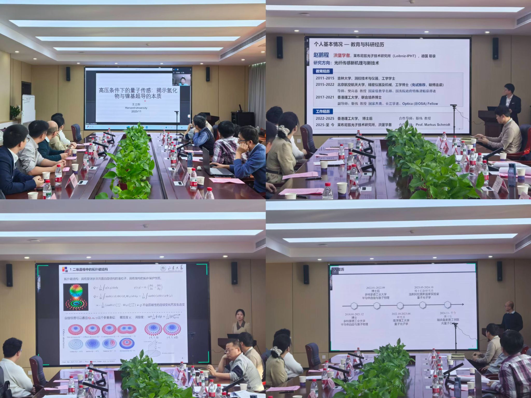下午的学术报告环节精彩纷呈。哈佛大学王之盼博士后聚焦“高压条件下的量子传感”,揭示氢化物与镍基超导的本质;德国莱布尼茨光子技术研究所赵鹏程博士后分享“光纤气体传感方法与关键技术”的最新突破;瑞典皇家理工学院强刚博士后则围绕“半导体纳米材料:从自旋与激子物理到光量子技术”展开深入探讨。与会学者的报告涵盖量子物理、凝聚态物理、光学、光学工程等前沿领域,展现了青年学者的学术风采,引发与会师生热烈讨论,现场思想碰撞氛围浓厚。