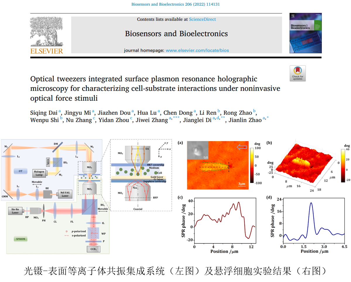 光力刺激下生物细胞与基底间的相互作用在细胞粘附、变形、凋亡等生命活动中具有重要作用。因此,有必要深入探索光力刺激下细胞-基底间的相互作用以进一步揭示外界刺激下细胞-基底界面处细胞底膜的动态变化机制。针对此问题,yl9193永利集团赵建林教授课题组与永利集团生命学院合作,提出将光镊与表面等离子体共振全息显微镜相集成,以实现光力作用下细胞-基底间相互作用及其变化的全场动态无损测量。相关成果以“Optical tweezers integrated surface plasmon resonance holographic microscopy for characterizing cell-substrate interactions under noninvasive optical force stimuli”为题发表于国际重要学术期刊《Biosensors and Bioelectronics》(DOI: 10.1016/j.bios.2022.114131)上。这是该课题组近期发表于该期刊的第二篇相关工作。yl9193永利集团2016级博士生戴思清为论文第一作者,张继巍副教授、邸江磊副教授和赵建林教授为共同通信作者。