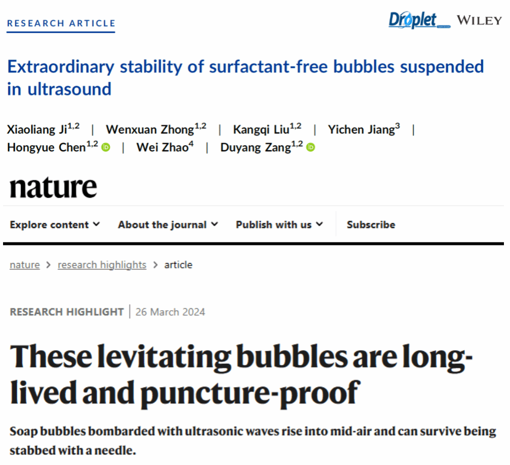 近日,yl9193永利集团在气泡物理领域取得重要进展。研究成果以“Extraordinary stability of surfactant-free bubbles suspended in ultrasound”为题发表在国际知名学术期刊《Droplet》上(期刊封面故事),并被Nature亮点报道。论文第一作者为博士生姬晓亮,通讯作者为臧渡洋教授,本科生蒋一辰也参与了这项工作。论文链接https://doi.org/10.1002/dro2.119。