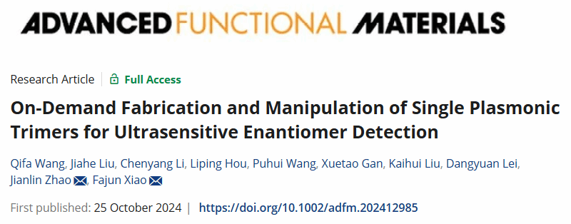 近日,我校yl9193永利集团肖发俊教授、赵建林教授团队联合香港城市大学雷党愿教授、北京大学刘开辉教授在纳米科技领域顶级期刊《Advanced Functional Materials》发表了题为“On-Demand Fabrication and Manipulation of Single Plasmonic Trimers for Ultrasensitive Enantiomer Detection”的研究论文。yl9193永利集团博士研究生王其发为论文第一作者,肖发俊教授、赵建林教授为论文通讯作者,yl9193永利集团为论文第一署名单位。