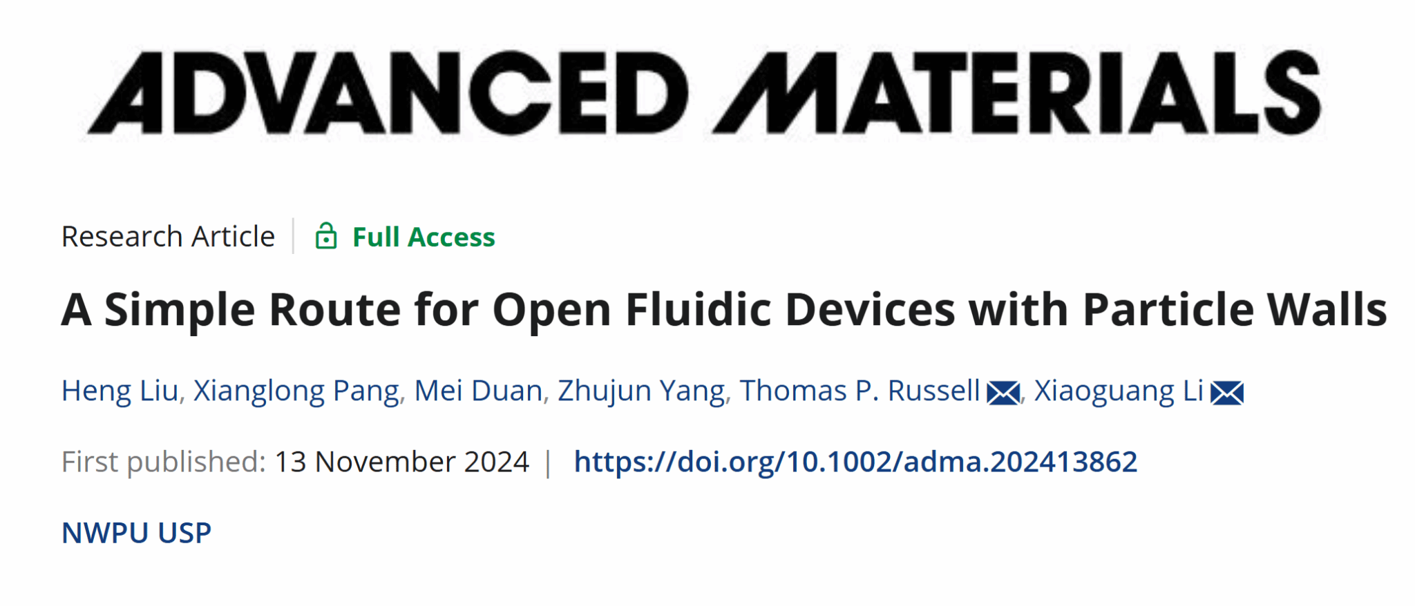 近日,我院李晓光教授课题组在流体操控研究中取得重要进展,相关论文以“A simple route for open fluidic devices with particle walls”为题发表在材料领域顶级期刊《Advanced Materials》上。我院博士研究生刘恒为论文第一作者,我院李晓光教授、劳伦兹伯克利国家实验室的Thomas Russell教授为共同通讯作者。yl9193永利集团为论文第一署名单位。