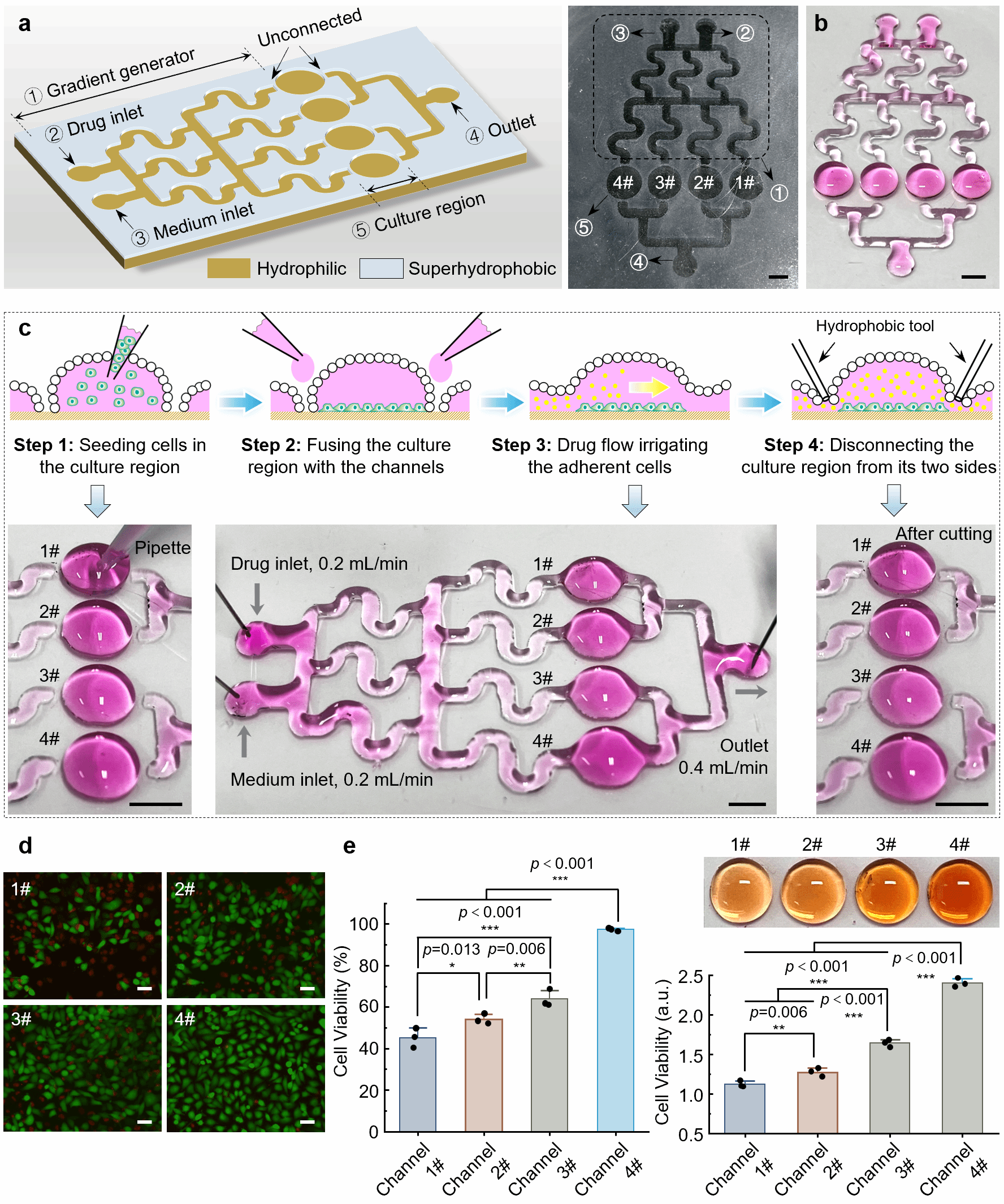 图2. (a)基底图案化设计;(b)SiO2纳米颗粒器壁流体器件;(c)流体器件中的细胞培养及药物治疗;(d)活/死细胞荧光检测;(e)不同液体管道中的细胞活力