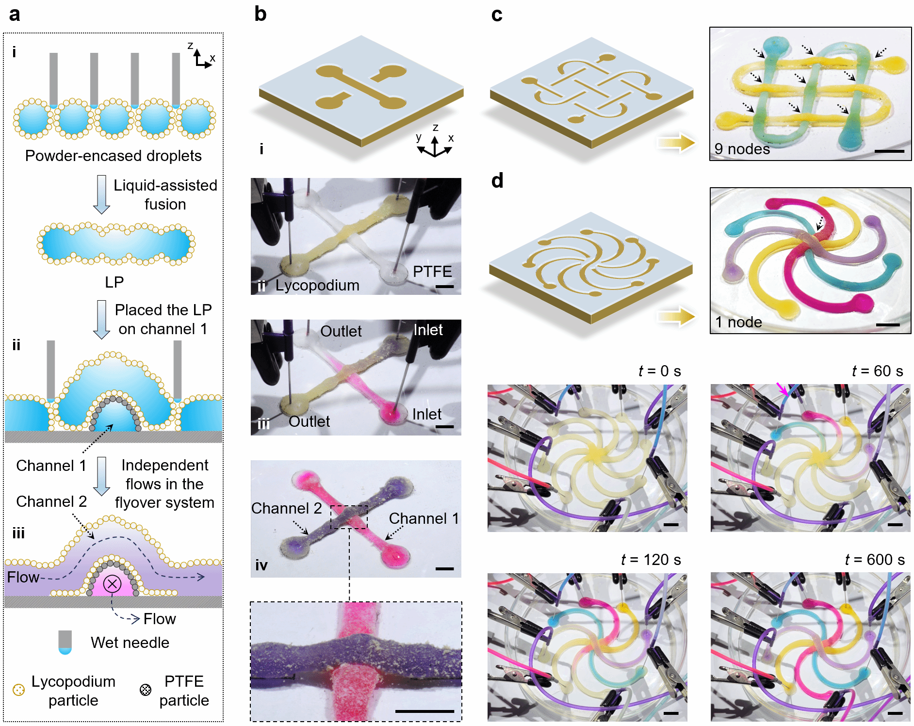 图1. (a)三维流体器件示意图;(b)利用石松粉和聚四氟乙烯微米颗粒构建十字型三维流体器件;(c)多节点型双层结构流体器件;(d)单节点型多层结构流体器件及内部流动
