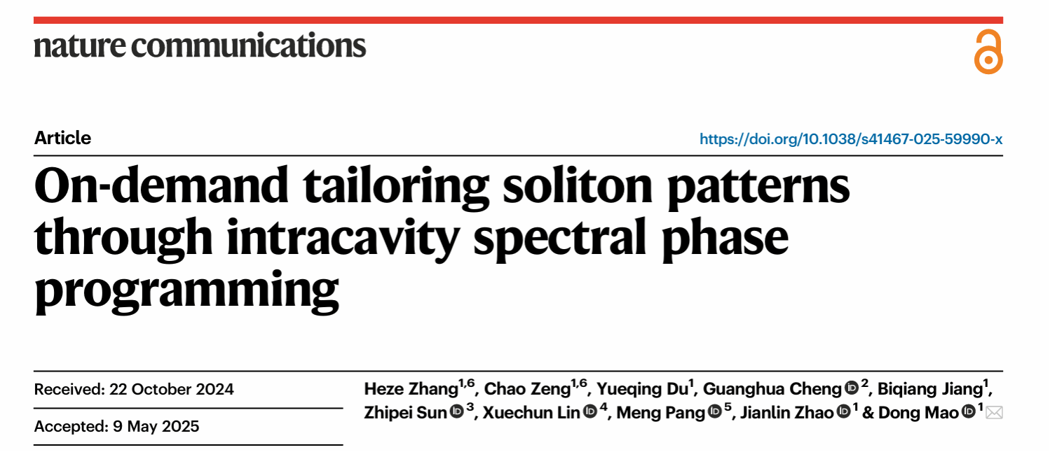近日,永利集团毛东教授、赵建林教授团队与中国科学院半导体研究所林学春研究员、上海光机所庞盟研究员、永利集团程光华教授以及芬兰阿尔托大学孙志培教授合作,利用光谱相位调控技术在光纤激光器中首次产生了具有可控间距的超短脉冲串,攻克了锁模脉冲时域位置难以主动控制的科学难题。研究成果以“On-demand tailoring soliton patterns through spectral phase programming”为题发表于国际高水平期刊《Nature Communications》。在读博士研究生张何泽和曾超副教授为论文的共同第一作者,毛东教授为通讯作者。论文链接:https://www.nature.com/articles/s41467-025-59990-x