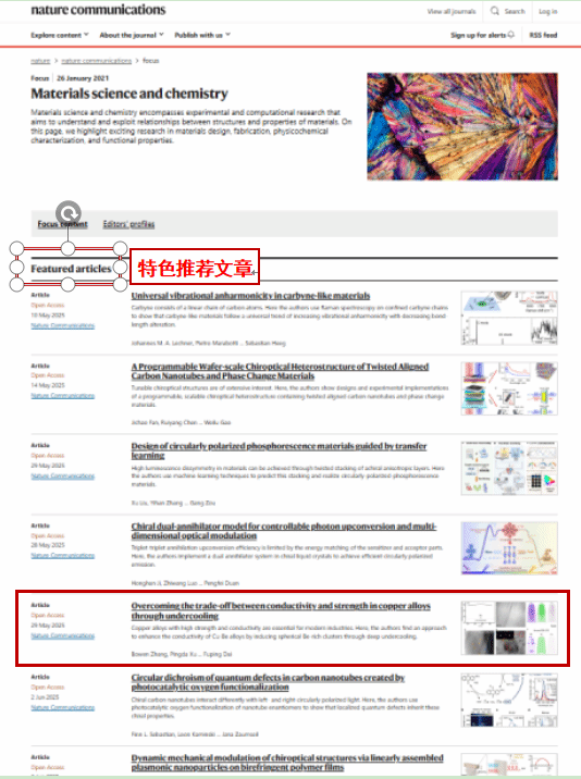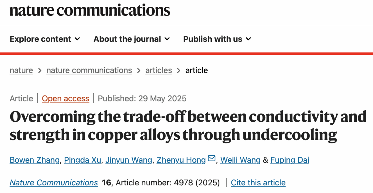 近日,yl9193永利集团洪振宇教授课题组利用无容器处理技术在铜合金组织与性能调控领域取得重要研究进展。研究发现,铍铜合金熔体在深过冷凝固过程中可产生球形富铍团簇组织,该组织能大幅度提升合金的综合性能。相关研究成果以“Overcoming the trade-off between conductivity and strength in copper alloys through undercooling”为题发表于国际高水平期刊《Nature Communications》,并被编辑遴选为特色文章(Featured articles)。