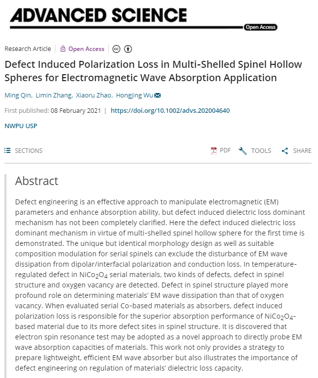 研究成果以“Defect Induced Polarization Loss in Multi-Shelled Spinel Hollow Spheres for Electromagnetic Wave Absorption Application”为题,在国际知名期刊《Advanced Science》上发表。论文第一作者为该院博士研究生秦明,通讯作者为吴宏景副教授。论文链接:https://onlinelibrary.wiley.com/doi/10.1002/advs.202004640,DOI: 10.1002/advs.202004640。