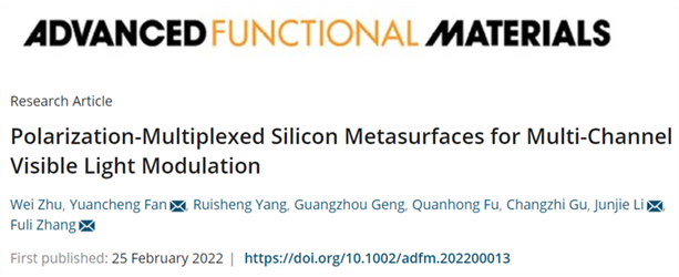 相关成果以“Polarization-Multiplexed Silicon Metasurfaces for Multi-Channel Visible Light Modulation”为题发表于高影响力学术期刊《Advanced Functional Materials》(DOI: 10.1002/adfm.202200013; IF:18.808)。西工大yl9193永利集团朱维博士为论文第一作者,樊元成教授、张富利教授和中国科学院物理研究所李俊杰研究员为共同通信作者。